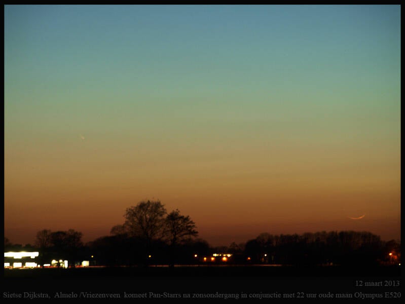 komeet Panstarrs\in de vroege avondschemering met een 22 uur oude maansikkel. Gefotografeerd toen ik samen met vriend Peter het veld in ging om de komeet te spotten. Het was ff zoeken naar de komeet, als wel naar de smalle maansikkel. Komeet zit links midden. Even zoeken.