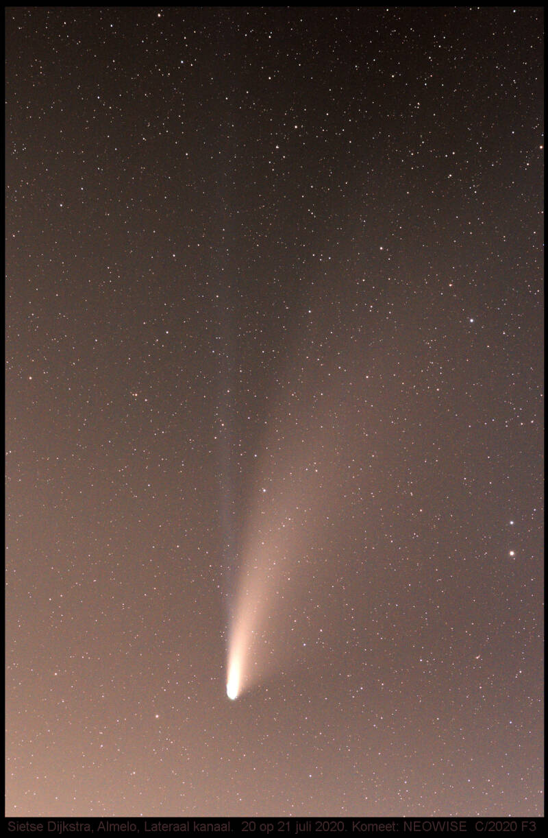 Medio juli was er een komeet die eindelijk weer eens goed met het blote oog waarneembaar was. Komeet Neowise met de wetenschappelijke naam: C/2020 F3. Normaliter wordt een komeet vernoemd naar de ontdekker. In dit geval was dat een ruimtetelescoop, de NEOWISE ruimte telescoop. Deze ruimte telescoop heeft meerdere kometen ontdekt die idd ook de naam Neowise dragen, maar dan met een andere aanduiding, zoals bijvoorbeeld de komeet: Neowise C/2022 P1. Inderdaad een komeet die door deze sonde niet in 2020, maar in 2022 ontdekt is. Echter de komeet die op deze pagina staat Neowise C/2020 F3 is door de sonde voor het eerst ontdekt op 27 maart 2020. Kort daarna werd de komeet al zichtbaar voor het blote oog. Het is en blijft altijd spannend wat een komeet in de loop der tijd met haar helderheid gaat doen?