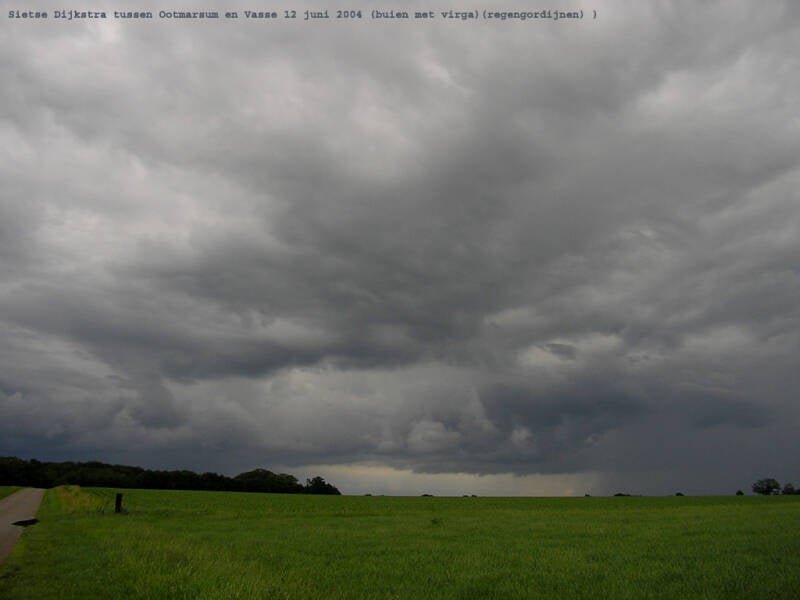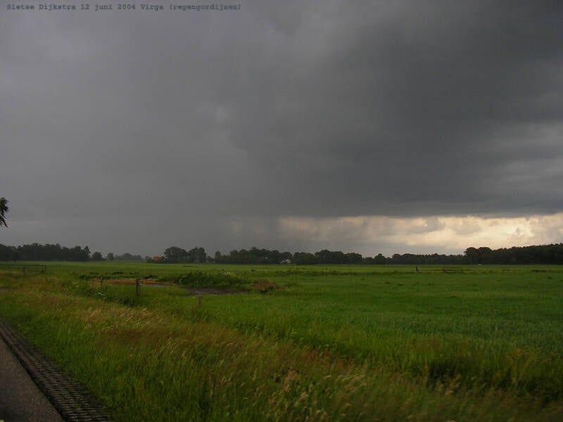 Hieronder 3 momenten die ik vastlegde van een normale bui met veel neerslag. Zo'n regengordijn zie je de grond raken en ook langzaam wuiven door de wind. De Latijnse benaming voor een regengordijn is Virga. Eigenlijk is dat officieel niet hetgeen je hier ziet. Virga is namelijk wel een valgordijn van regen in de verte, zoals je hier ook ziet, maar raakt normaal gesproken de grond niet.Virga is dus wel een regengordijn, maar die verdampt voor het de grond raakt.