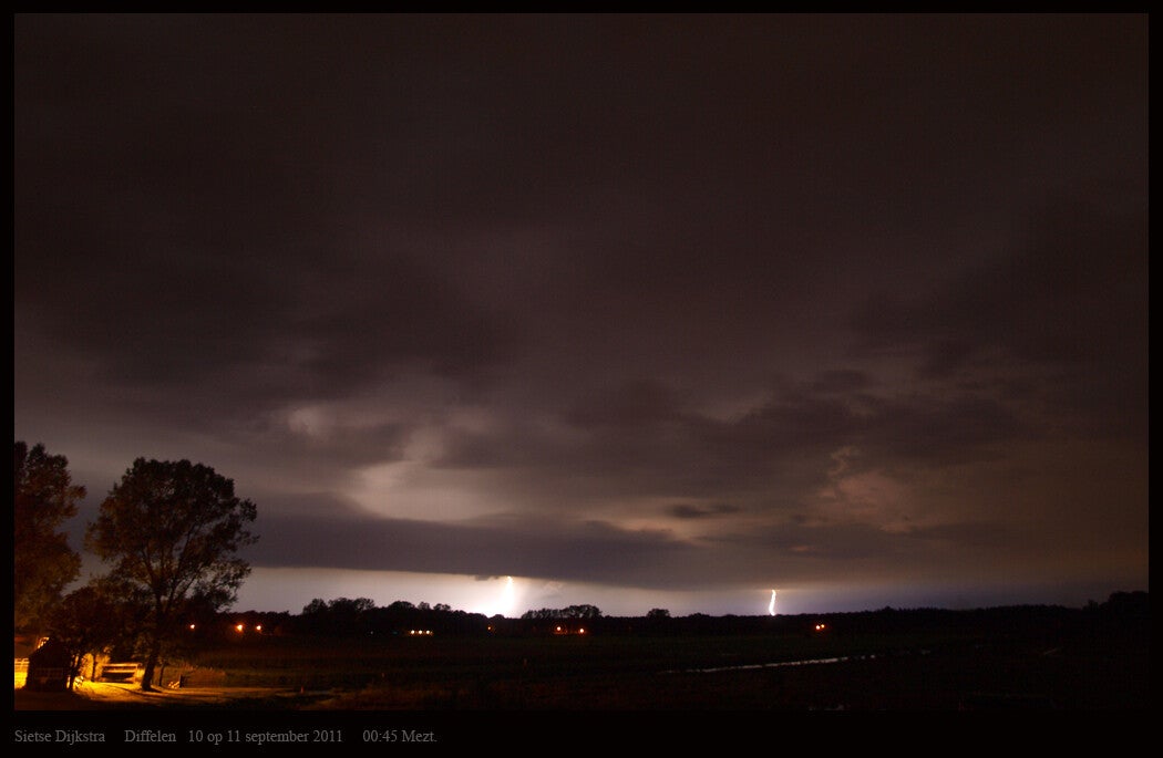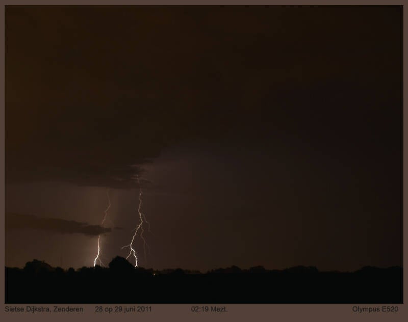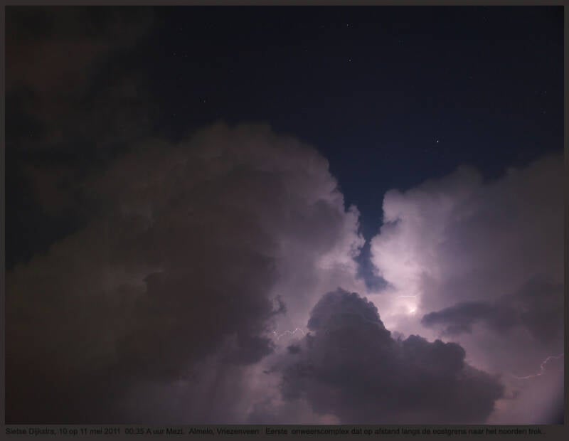 Nadat deze was overgetrokken en was gefotografeerd werd besloten naar onze sterrenwacht in Lattrop te rijden. Daar konden we wachten op evt nachtelijk onweer en het ons behaaglijk maken. De bliksems waren een beetje tegenvallend, maar onderweg weer terug naar huis, besloten Chiel en ik nog een tweede lijn met buitjes op te vangen en besloten samen naar Zenderen nabij Borne te rijden. Daar konden we nog aardig wat leuke plaatjes van bliksem schieten, getuige de opnamen.